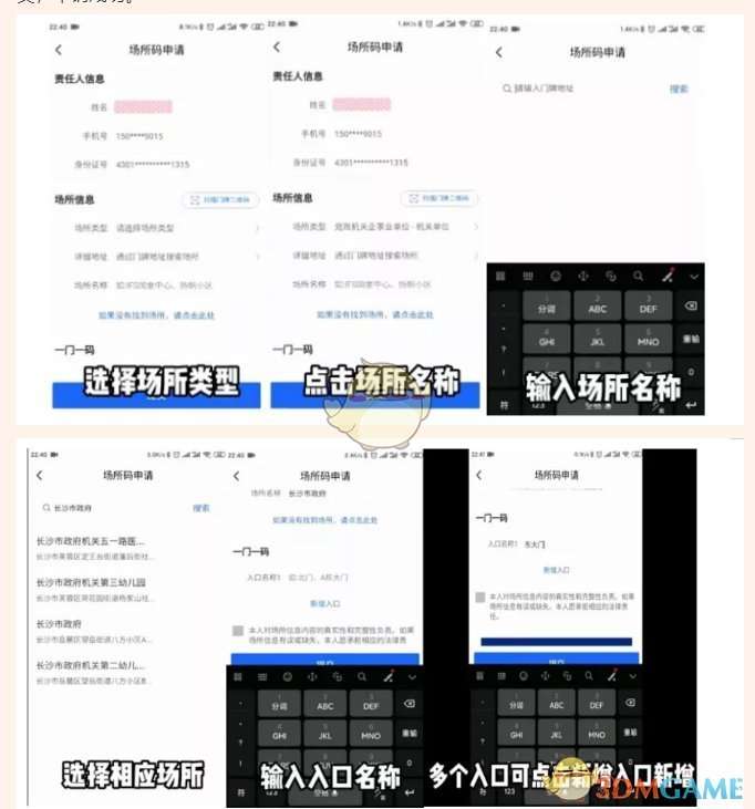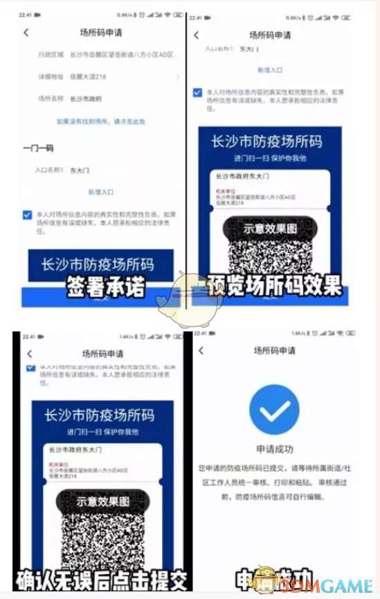 选择“场所类型”,点击“场所名称”,输入场所名称,选择相应场所,输入入口名称,多个入口可点击“新增入口”新增,签署承诺,预览场所码效果,确认无误后点击提交,申请成功。