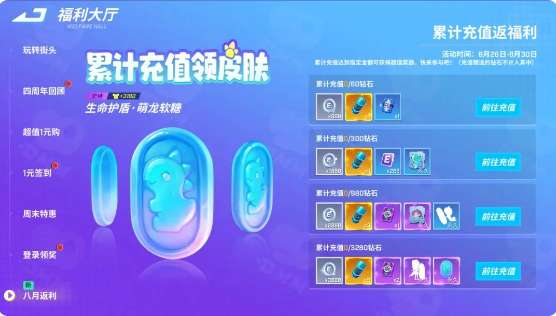 08月26日至08月30日,累计充值达一定额度可获得永久道具卡皮肤【生命护盾·萌龙软糖】以及限定涂鸦、灵感胶囊等丰富奖励!