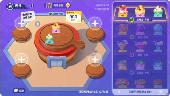 08月03日至10月09日,将自己拥有的一只恐龙养满级后,可以使用自己拥有的食材邀请好友携带恐龙参与宴会。参与宴会的恐龙能获得经验奖励哦!