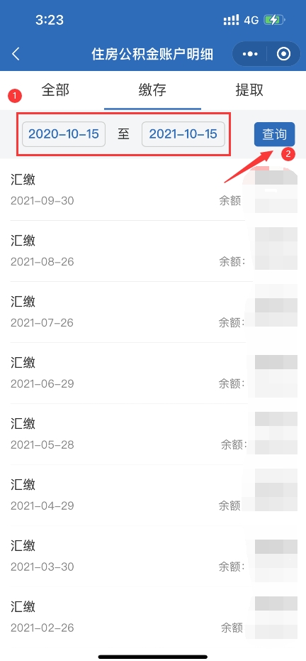 3、选择你想查看的日期,然后点击查询就能看到每月的缴额以及余额