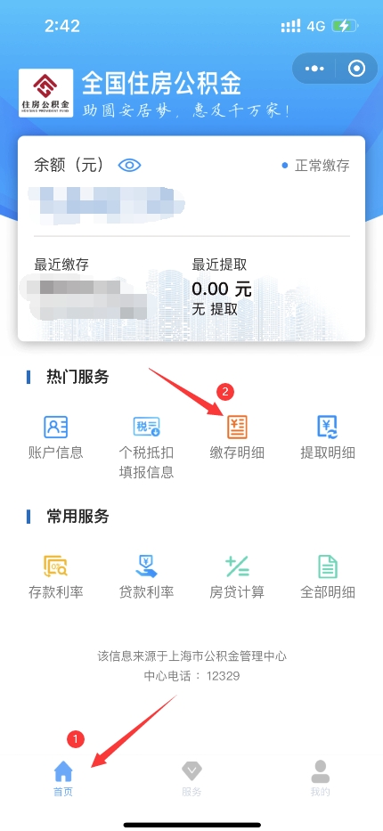 2、点击首页,找到“缴存明细”功能进入
