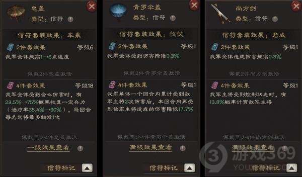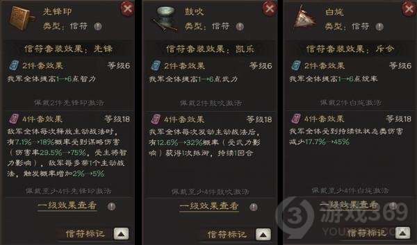 【鼓吹】分析:需要武力加成概率,推荐蜀枪或是乐进队伍使用,用作防御的信符
