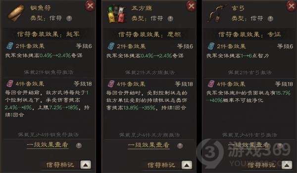 【铜鱼符】:当控制达到3种时比兵书“以治击乱”的增伤还高,搭配武峰阵的挑拨和孙坚的嘲讽(稳定控制)可以抵消掉对手10%的减伤。搭配以治击乱和引弦力战,群攻效果可以超过70%(原52%)