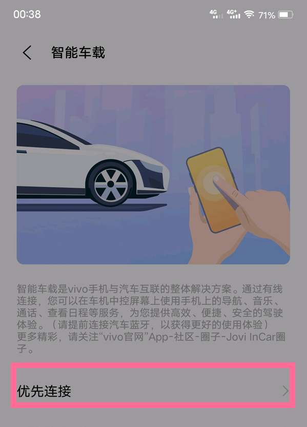2、选择智能车载,点击优先连接,选择自己需要的车载方式就可以了。