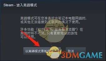 1、点击位于主页面左上角的“steam”键,在下拉菜单中找到“进入离线模式”并单击该选项。