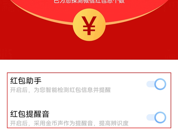 3、将【红包助手】和【红包提醒音】开关开启即可。
