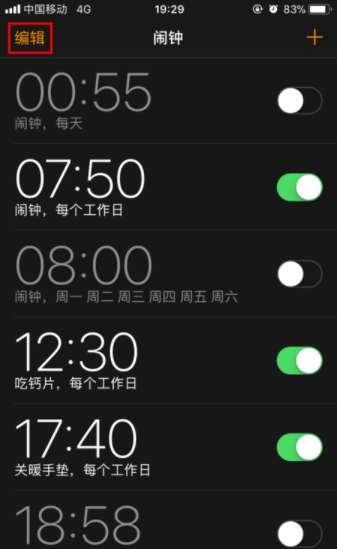 2、点击左上角的编辑,将闹钟时间设置好。