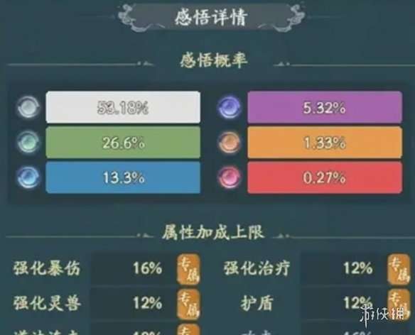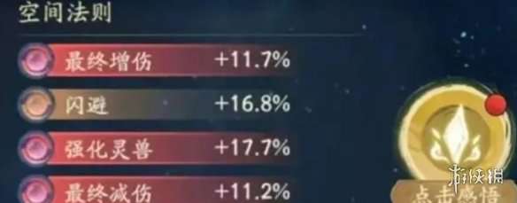 二、五行法则 1、五行包括金、木、水、火和土五种法则,全部解锁需要1000次感悟,共需1万悟道石,每种法则需要感悟200次才能解锁3个全部感悟孔位。 2、属性选择:五行法则推荐玩家选择强化灵兽、强化治疗、攻击这三种类型的属性。 3、先推荐飞影选择强化灵兽属性,玩家在刷到红色的可以选,其他颜色不推荐选择。