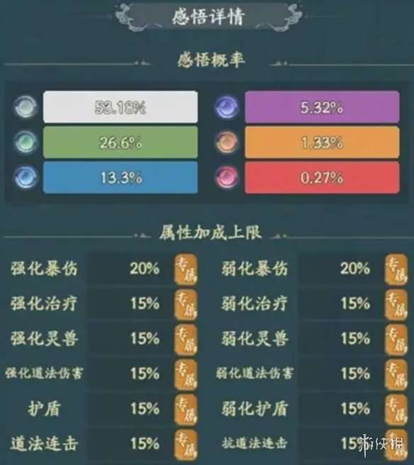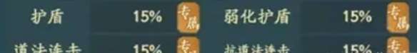 2、弱化护盾:弱化对方护盾,如果对方没有护盾则无效。 3、道法连击:释放道法时连击释放,与对方抗道法连击相互抵消。 4、抗道法连击:降低对方道法连击属性。