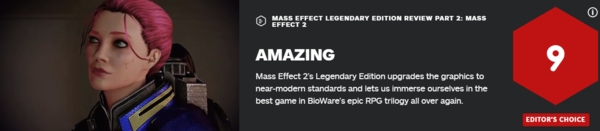 《质量效应:传奇版》包含《质量效应》《质量效应 2》及《质量效应 3》单人基础游戏及超过40款DLC。此前IGN一堆游戏第一部分进行了评测,并给出了8分。现在IGN为本作中《质量效应2》部分给出了9分评价。IGN表示《质量效应2》现在游玩起来就像是一部现代的、第三人称的射击游戏,由于其进行了4K升级,使得它(的画面)看起来足够棒。