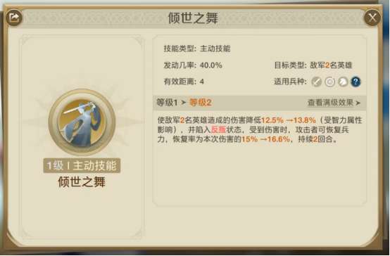 技能是虞美人的亮点所在,一技能使敌军2名英雄造成的伤害降低,并陷入反叛状态,受到伤害时,攻击者可以恢复一定的兵力。这个技能通俗点来说就是先给对方上个降攻debuff,再上个反叛debuff,我方友军攻击这个反叛debuff的敌人会按伤害量恢复一定兵力。这个技能让虞美人可以塞进任何需要续航恢复的队伍,能保证全队的存活率和战损率,弥补了属性上的不足。
