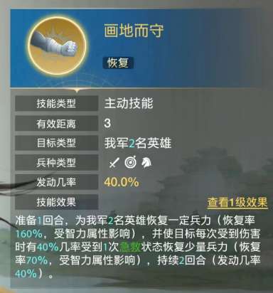 画地为牢,主动技能,有效距离3,发动几率40%,效果是为我军2名英雄恢复一定兵力,并且有几率受伤时得到一次急救效果。