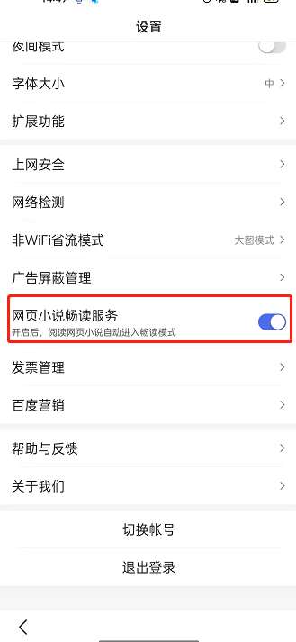 3、将如图的【网页小说畅读服务】右侧按钮开启即可。