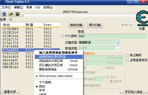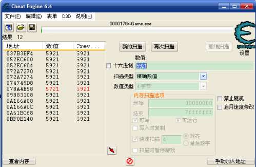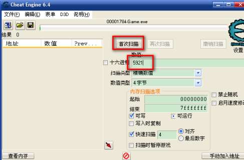 在数值窗口中,输入5921,点“首次扫描”开始查找内存地址,扫描结束会在左面结果中显示找到的地址。当结果只有一个时,就是找到了金币的内存地址。找到多个地址时,还要进行“再次扫描”。