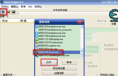 打开CE修改器,点左上角的图标,弹出“进程列表”窗口,从列表中找到前面是DNF的图标后面有Game的进程,这个进程就是DNF在内存中的进程,然后点“打开”。