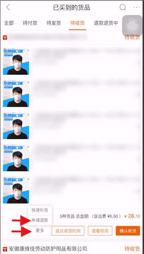 3、在需要退款的订单下方点击更多,选择申请退款,