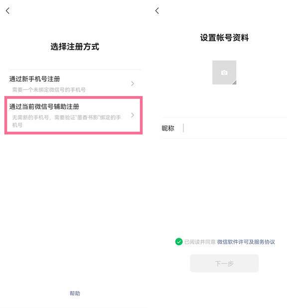 4、选择通过当前微信号辅助注册,通过辅助的微信号手机验证后即可注册。