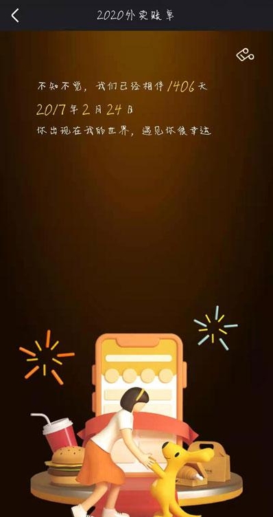 6.等待加载完后之后,我们就可以看到自己的专属外卖账单了,通过该账单,我们可以看到自己使用时间、最晚下单时间、常点外卖、打卡店铺数量等等。