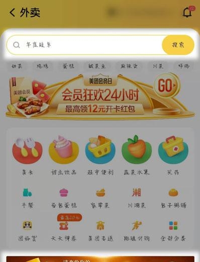 4.之后,在美团外卖页面,点击上方的搜索框,输入【年度账单】关键字,或者点击下方横幅进入;