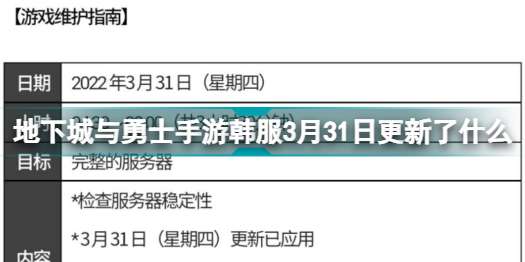 地下城与勇士手游韩服3月31日更新了什么?DNF手游韩服3月31日会更新什么是很多玩家都很关心的问题几点钟开始更新?今天的更新其实已经结束了,下面小编就带大家看一看DNF手游韩服3月31日更新公告。