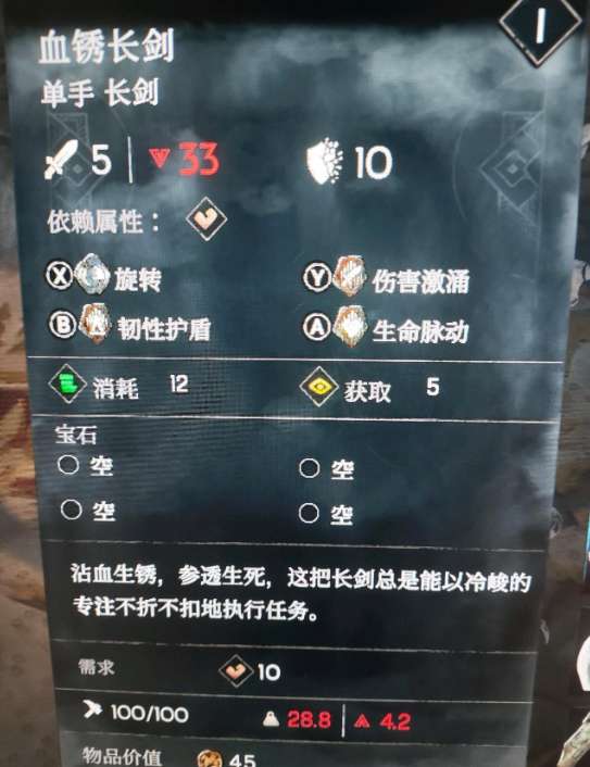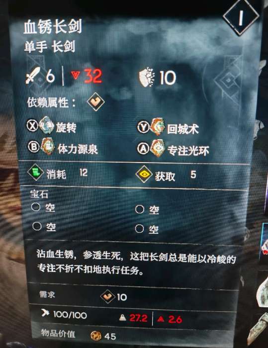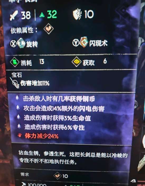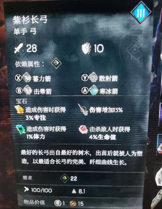 弓箭是副手武器,日常主副手是同时使用的,主手的伤害回专注和回血词条,副手武器攻击也能触发,最低要求词条,造成伤害时获得专注,回血词条可以带乌鸦戒指,攻击段数多,回血量也很足,基本一箭能回大半管。