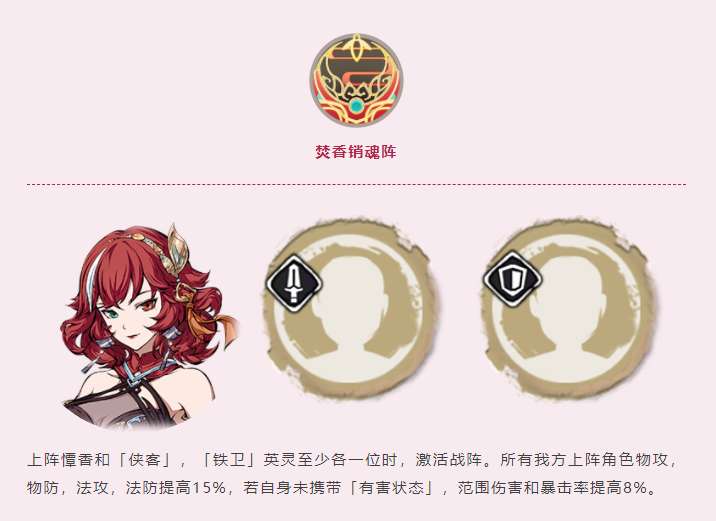 上阵憛香和「侠客」,「铁卫」英灵至少各一位时,激活战阵。所有我方上阵角色物攻,物防,法攻,法防提高15%,若自身未携带「有害状态」,范围伤害和暴击率提高8%。
