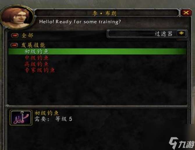 4、点击对话框,选择发展技能。点击初级钓鱼。