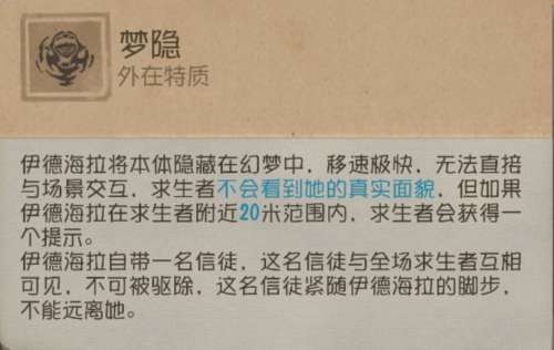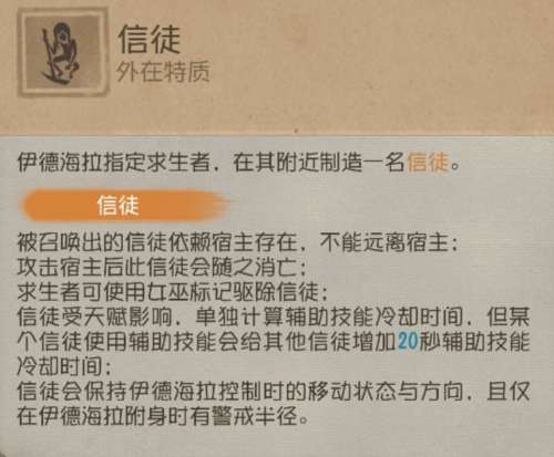 ①梦之女巫寄生求生者产生的信徒以该求生者为宿主,并拥有互相透视、超距加速跟随等特性;
