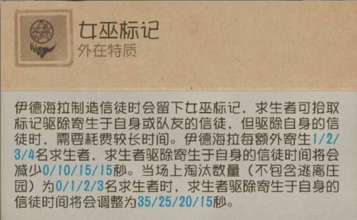 ①拾取了女巫标记的求生者可以给自己或他人驱除信徒,为自己驱除信徒会比为他人驱除信徒耗费更长时间;