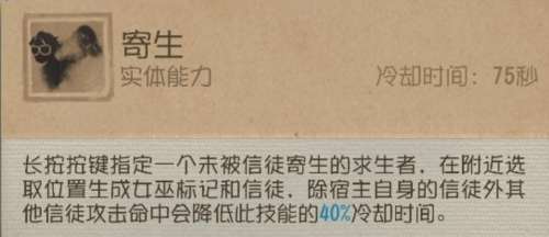 ②当使用除了宿主的寄生信徒外任一其他信徒攻击命中该求生者时,寄生技能的冷却时间会降低40%。