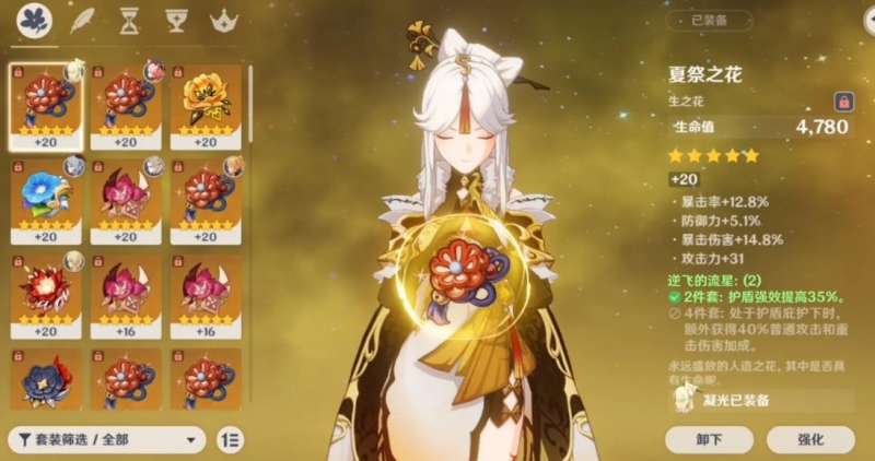 第二套选择的圣遗物是逆飞的流星,比较适合走半辅助路线的凝光。凑齐两件套后,可以增加该角色百分之三十五的护盾防御。在凑齐四件套以后,凝光在处于护盾的保护之下的时候,就会额外得到百分之四十的普攻与重击伤害加成。装备这套圣遗物的凝光能够获取更加稳定的护盾,自己打出元素反应后能触发晶片护盾,战场时安全感更高,不容易暴毙。