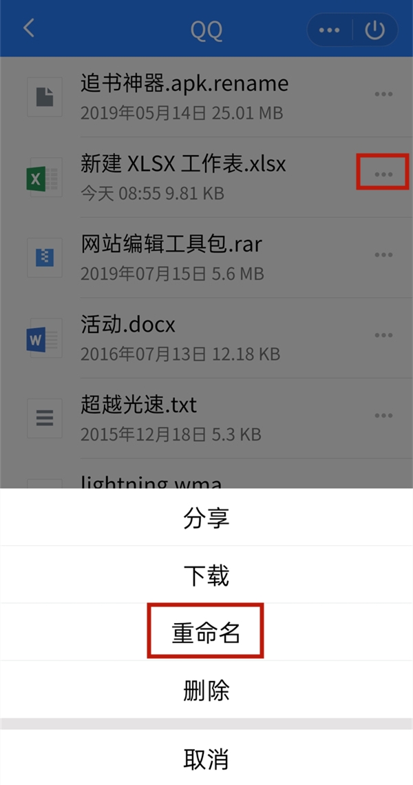 4、点击文件后面的三点图标后,点击重命名后编辑文件新名字即可。
