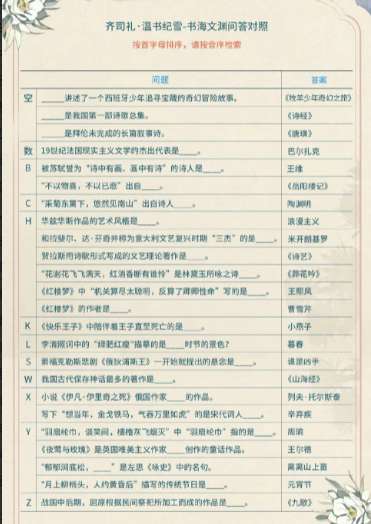 好啦~以上就是温书纪雪佳卷搜罗答题答案大全汇总内容啦~希望这份光与夜之恋温书纪雪问答对照表一览图文内容能够对你有所帮助呀~