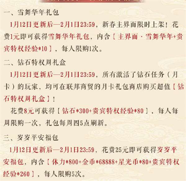 4:最后就是复刻了,在此期间,花费一块钱即可获得雪舞华年礼包,包含了不少的东西,这次的复刻套装是紫藤花誓言,辞绣闺,同时还有誓言之戒礼包同步上架。