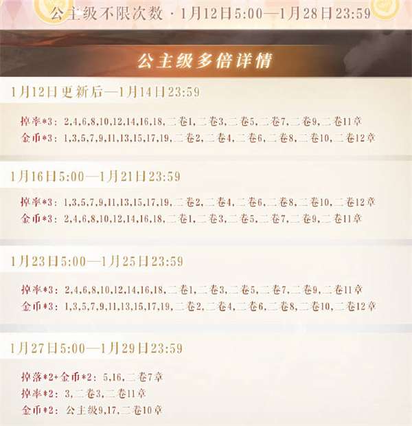 2:然后还有公主级多倍的奖励,具体的时间如图所示,其中还有掉率三倍,金币三倍等等的活动;