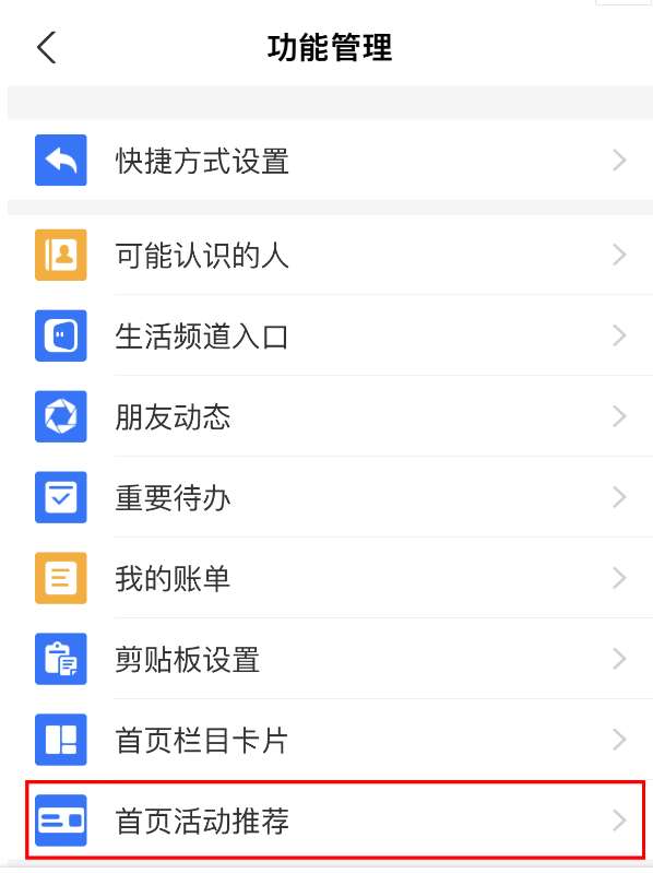 3、进入功能管理后可以发现在首页栏目卡片下方多了一个首页活动推荐,点击进入。