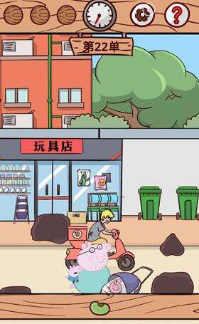 3、 一方通行——点击五金店招牌上的吸铁石,对转盘使用吸铁石,获得奶牛玩具,对路边的神秘人使用奶牛玩具,获得豆子,把玩具店门口箱子里面的佩琪玩具放进婴儿车里,滑动前进,到达目的地,按门铃