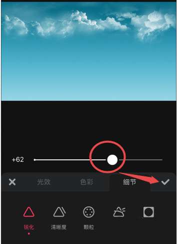 4、最后,左右移动滑块,调节锐化程度后,选择确认即可。
