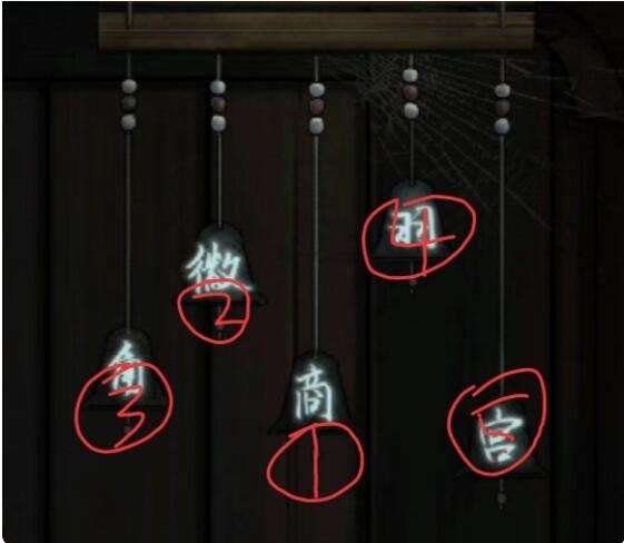 门上贴的画上有字符记下,窗口瓷器拿上,下方砖头有一块可以点,按门上字符 解开,有一本书和信, 书上提示是门左侧风铃的,窗下方板登点一下掿到风铃下方,按商徵角羽宫点击,得到开门的钥匙,