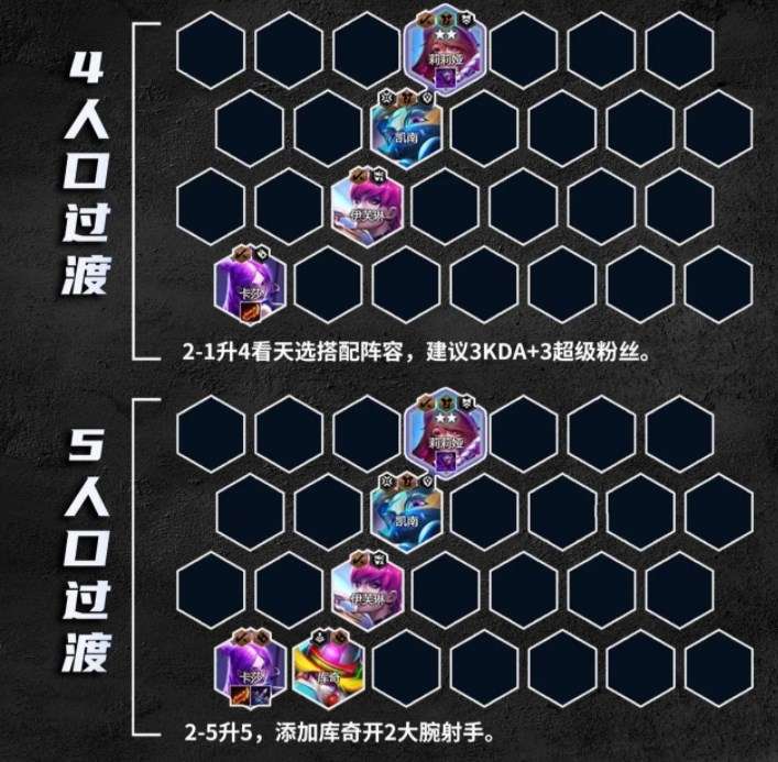 1、2-1升4人口、2-3/5升5人口,看天选搭配过渡阵容,有啥用啥,比较建议用3KDA+3超级粉丝+2大腕射手过渡最优。