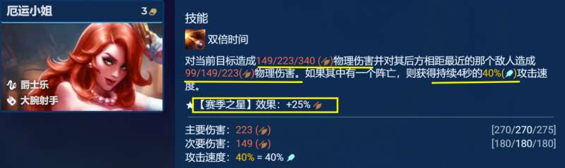 8、能快速帮厄运小姐打残敌方弈子,有几率配合上厄运小姐技能击杀获得攻速加成。