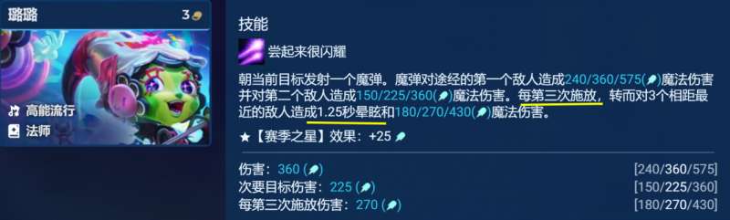 9、最关键的是璐璐每第三次施放技能,还会对3个相距最近的敌人造成1.25秒晕眩,限制了敌方棋子的输出频率,在面对残局时大幅度提高了对厄运小姐的保护。