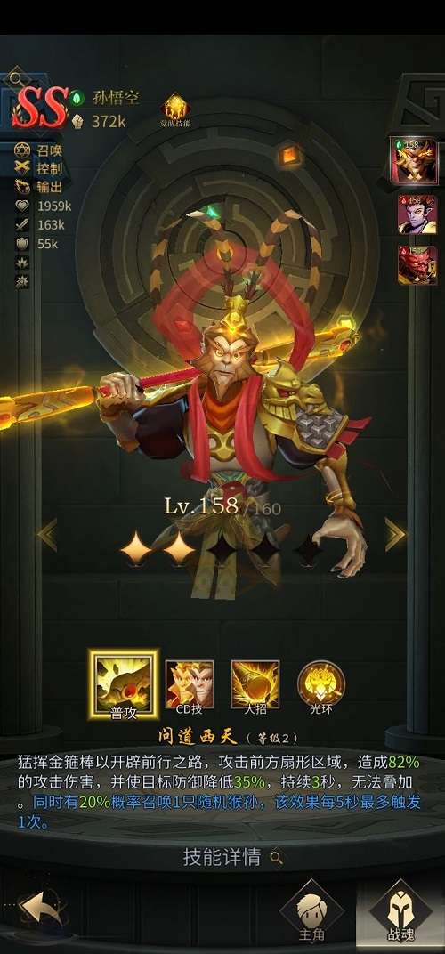 2、猴子的觉醒技能:是增加猴孙攻击力,每只猴孙增加10%攻击力,一般都会有6-7只,相当于给猴孙增加60%以上,作用相对不大,如果加在猴子上就无敌了。
