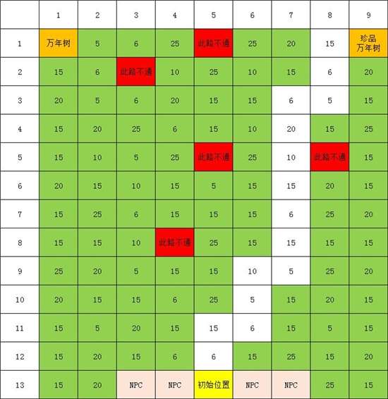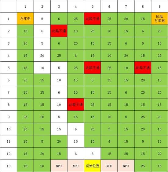 根据上图,可以找到消耗元宝最少的路线,珍品万年树的路线为: