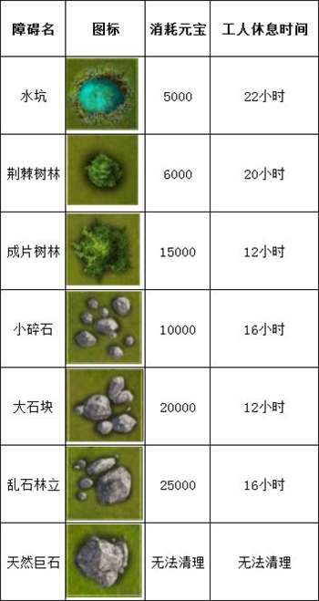 角色在下方正中,两侧都是工人,左上角为万年树,右上角为珍品万年树,其他格子都是各种类型的障碍,玩家需要清除前往万年树路上的障碍,打开一条通路以后把万年树带回家,具体方式为花元宝请工人帮忙清理,每次清理后工人都需要休息一段时间,使用1块和田玉可以让工人马上投入下一次工作。根据障碍的不同,花费的元宝和工人休息的时间也不同,对应关系如下: