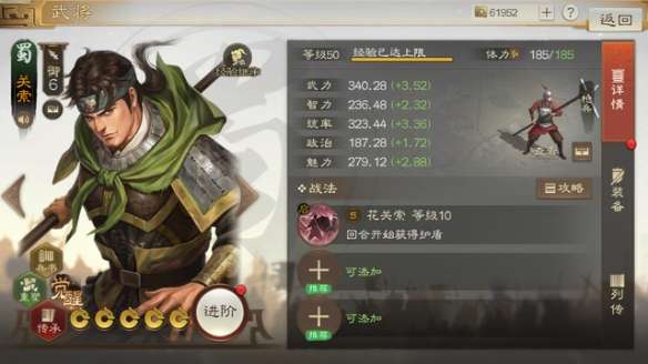 关索,蜀国6御枪兵,武力和统率成长相对优秀,但智力成长属于中等偏下。