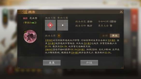 【被动】回合开始时自身获得106%护盾,持续2回合,受武力影响,且不受兵力降低影响。根据自身护盾提升造成伤害,最多提升至32%。