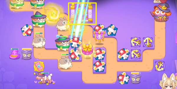 1、阿波与魔法宝藏第24关开局给了我们很多金币,我们从左往右建造,优先建造激光炮塔,去拆掉右边的小道具。