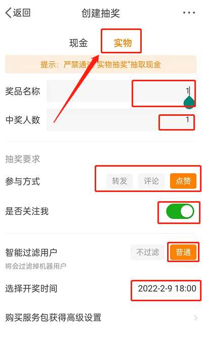将下面红框部分全部填好,选择1人中奖,普通过滤。