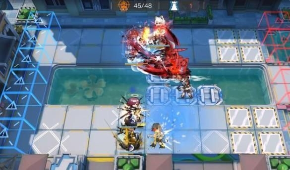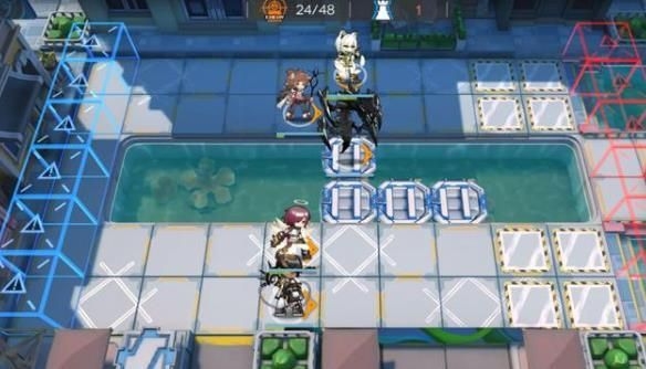 这一关难点较多,一个是两拨敌人潮不好搞定,这里考虑用4个干员来针对,开局先布置凯尔希,在第5格位置冲下攻击,先布置M3大哥冲上攻击,然后cost卡14点布置能天使冲右侧攻击。cost好了布置小绵羊,然后在中间水域的下方放3个平台,期间补个棘刺,上路的大力水手过来的时候马上开凯尔希技能搞定,马上撤掉M3,避免后续能天使过载对轴失败。